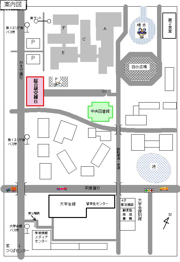 つくばセンターで、関東鉄道バス「筑波大中央」行、または、「筑波大学循環右回り」に乗り換えて15分で「第一エリア前」バス停で下車、徒歩1分