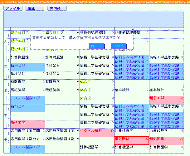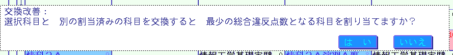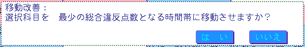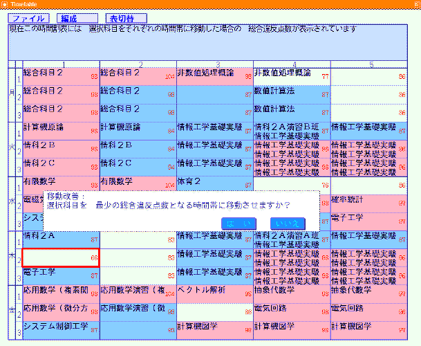 さらに、これらの候補(コマ)の中から、一番制約違反が減少する候補 (最少の総合違反点数)を「赤」の四角で囲み、 さきほど選択した科目をそこに移動するかどうかをユーザに問い合わせます。
