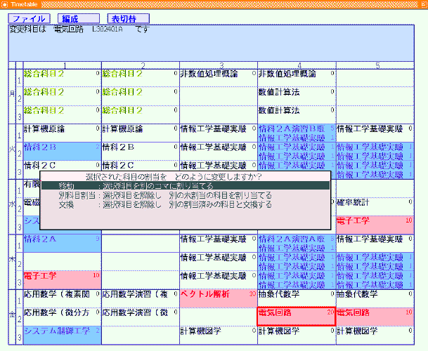 この例は、画面例No.2で、「別科目割当」や「交換」を選択した場合です。 「別科目割当」や「交換」では、改善する時の候補が科目になりますので、 このように科目表を色分け表示します。