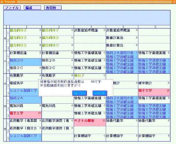 本編成モードは、ユーザと対話しながら、制約違反点数を少なくするように改善していくことで、 制約違反の(少)ない時間割を編成するものです。