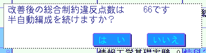 結果として、当初、違反点数の合計が96点であったのが、 66点に減少しました。つまり、制約違反が減少したことになります。 このようにして、本編成(半自動編成)は、システムとユーザが対話することによって、 制約違反をなくすように編成することができます。
